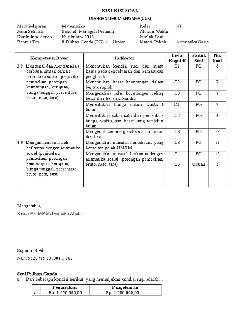 Menghargai dan menghayati perilaku jujur, disiplin, tanggungjawab, peduli (toleransi, gotong royong), santun, percaya diri, dalam. Agar kalian lebih mengerti tentang potongan pajak ini, maka kita akan membahasnya dengan menggunakan contoh soal sebagai berikut : Soal ini merupakan soal uji kompetensi 6 yang terdiri dari 20 soal pilihan ganda. Apa yang dimaksud dengan aritmetika Pak sandy adalah seorang pegawai dengan gaji bersih rp4.050.000. Rpp matematika smp kurikulum 2013 rencana pelaksanaan pembelajaran. Harga pembelian 100 buku tulis adalah rp 180.000,00. Pak triyono membeli keperluan kantor di toko alat tulis kartika yaitu 20 kotak kapur tulis dengan harga rp 60.000,00 kemudian 14. Menyelesaikan soal aritmatika dengan baik hal ini terjadi karna siswa tidak memahami masalah pada soal. Berilah tanda silang (x) huruf a,b,c, atau d pada jawaban yang paling benar ! Ibu membeli 50 buah kue seharga rp. Jadi mulai sekarang jangan takut dengan matematika karena ia sangat bermanfaat. Jika dalam kurikulum 2006 materi aritmatika sosial diberikan pada kelas 7 smpmts pada semester 1 namun berdasarkan kurikulum 2013 edisi revisi 20162017 materi aritmatika sosial disampaikan pada kelas 7 smpmts di semester 2.